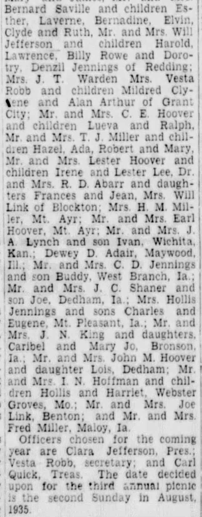 from The Times-Tribune (Grant City, Missouri), 15 Aug 1934. Second annual picnic of the descendants of the James A. Miller , Wm. Miller and H. T. Miller families which was held Aug. 9 when 130 relatives partook of the dinner. Dewey D. Adair and others were mentioned.