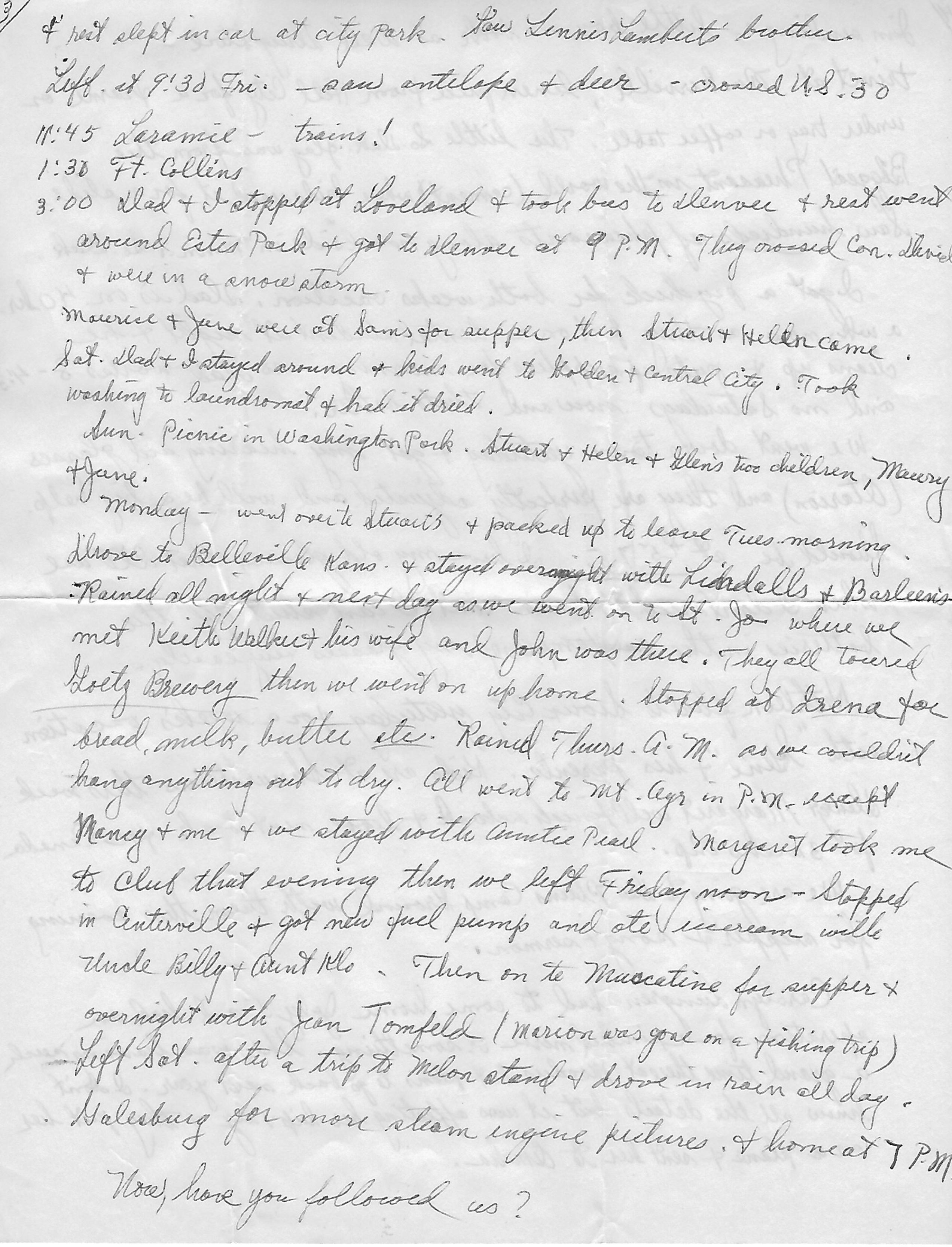 Letter written July 27, 1958 talks about July 4 in Milwaukee and Chippewa Falls tornado. Trip continues to Duluth and steam train ride. On to Paul Bunyan Park and the Badlands in South Dakota. Then Wall Drug Store, Mt. Rushmore, Wyoming, and Denver. Visited Maurice & June at Sam Adair home. Visited by Stuart & Helen Hoover. In Kansas stayed overnight with cousin (Barleen) before Mt. Ayr, Centerville, and Muscatine, Iowa. Mary & Earl working in Melrose Park, Illinois; their age is early 60's now. Pompilio family has NOT moved in next door yet; house is empty. Marvin & Tom gone to Comiskey Park to see Red Sox and White Sox. Earl interested in Volkswagen station wagon.