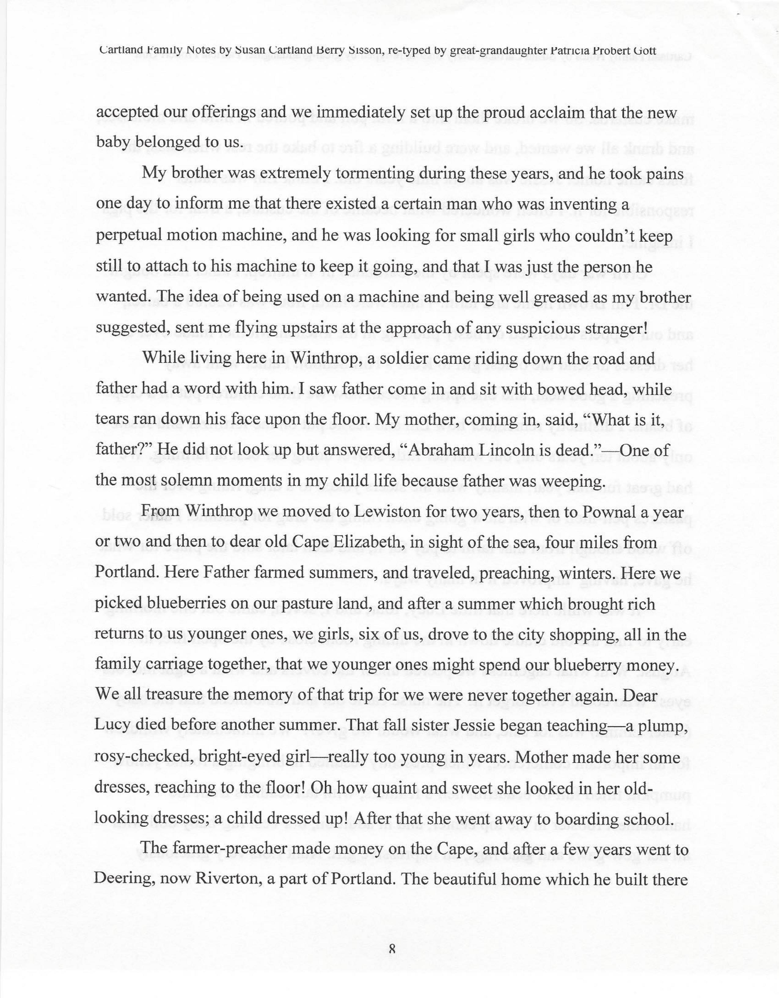 Notes about the Stephen Cartland Family…1925 Cartland Family Notes by Susan Cartland Berry Sisson, re-typed by great-granddaughter Patricia Probert Gott
