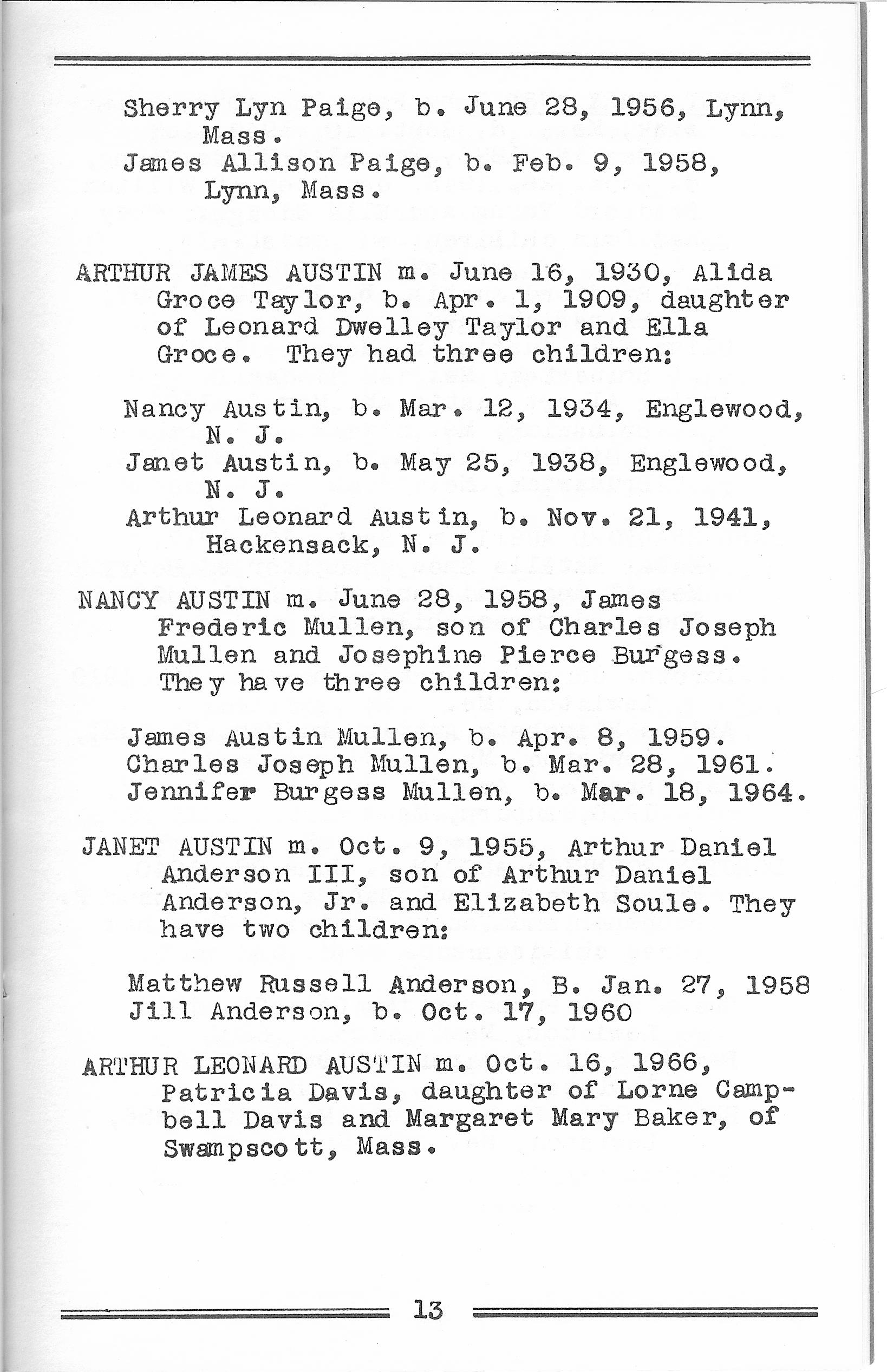-- Small book compiled by Ann Austin Twomey, 1967. The author’s aunt is Mary C. Austin who married Cyrus Frank Cartland. This booklet has descendants of these Austins and includes names of Cartland and Twomey.