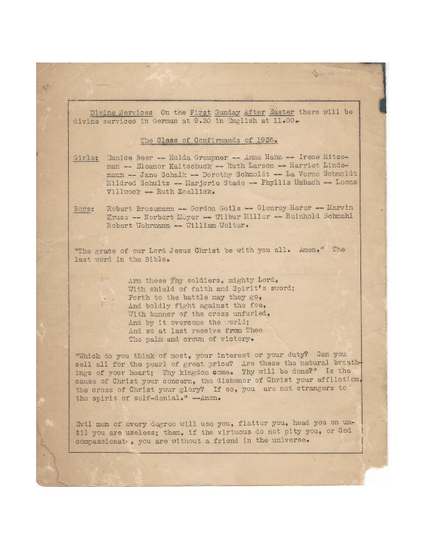 Immanuel Lutheran Church bulletin of 12 April 1936 lists the Class of Confirmands of 1936. Notice the bulletin is mostly German.