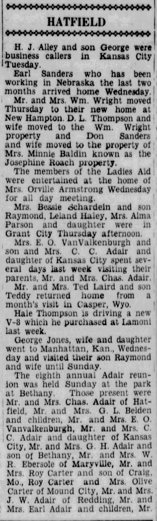 From The Times-Tribune (Grant City, Missouri) newspaper 11 Aug 1937. Included is story about the 8th Annual Adair Family Reunion.