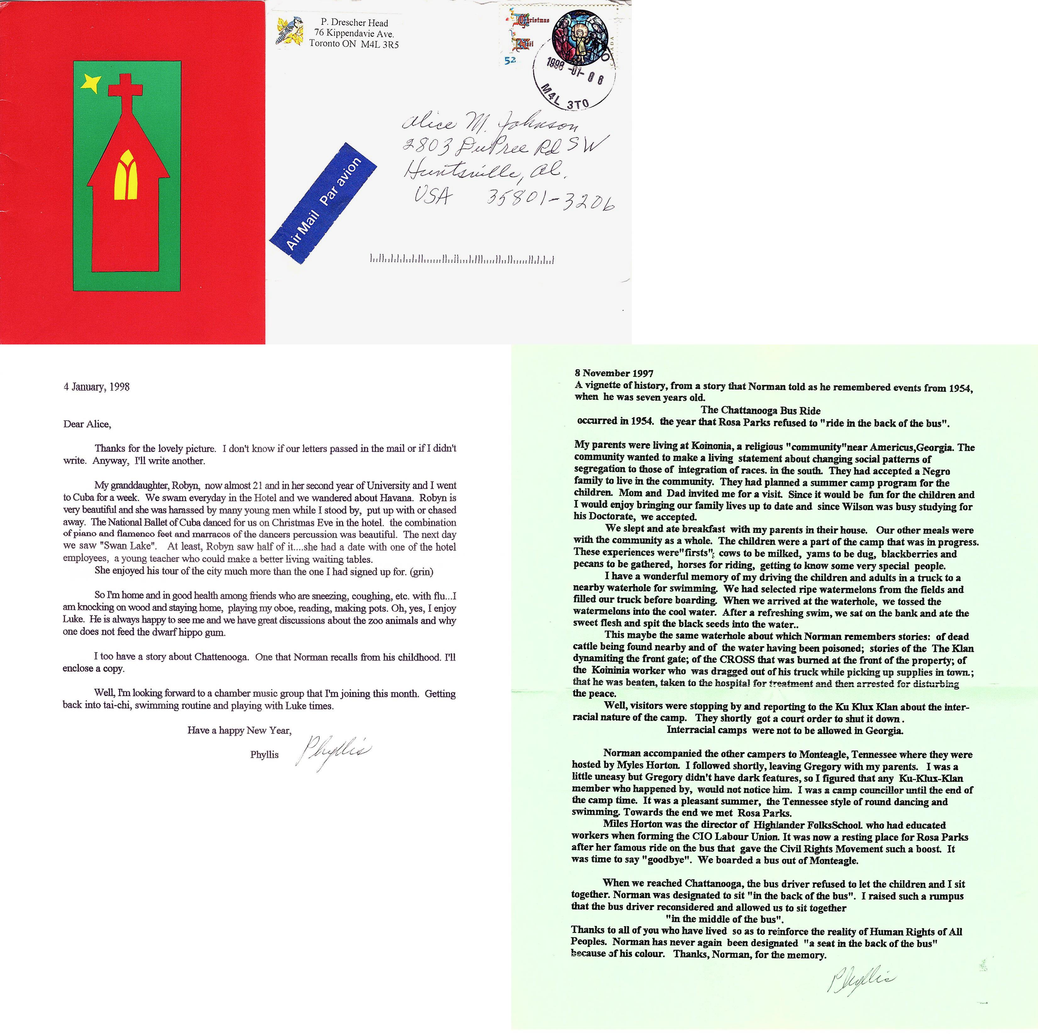 Letter written by my Mom’s 1st cousin, Phyllis Drescher. Phyllis and her son Norman experienced at Koinonia Farm in Georgia that her parents (Christian and Jennette) lived. Phyllis was married to Wilson Head and they had another son Gregory and 2 daughters. This is a letter that Phyllis shared in 1998 remembering The Chattanooga Bus Ride and Rosa Parks in 1954.