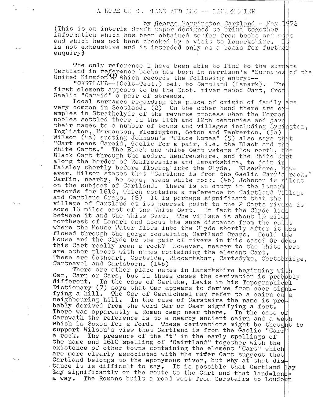 There can, I think, be little doubt that the name has been associated with that particular part of Scotland for many centuries. Ptolmy’s map of Scotland shows ‘Colaeria’ close to the site of modern Lanark. The remains of Roman/____ in the area of Cartland suggest that Colaenia ia latinization of the name Cartland. It this is correct the name goes back a very long way indeed.