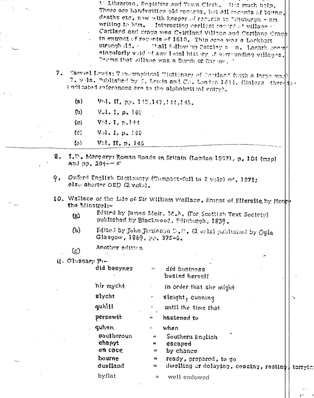 You will see from my note that I have tried to follow up your reference to [?] being entertained by the Cartland's of Lee. I have searched many books and read the prefaces to the two main editions of his works: the Kilwaruork[?] & the Edinburgh. There were fully less important editions & works not all of which I have you got hold of. Could you let me have any more information about this reference/that would help. I can trace no reference to a statue of Wallace but it could easily be there.