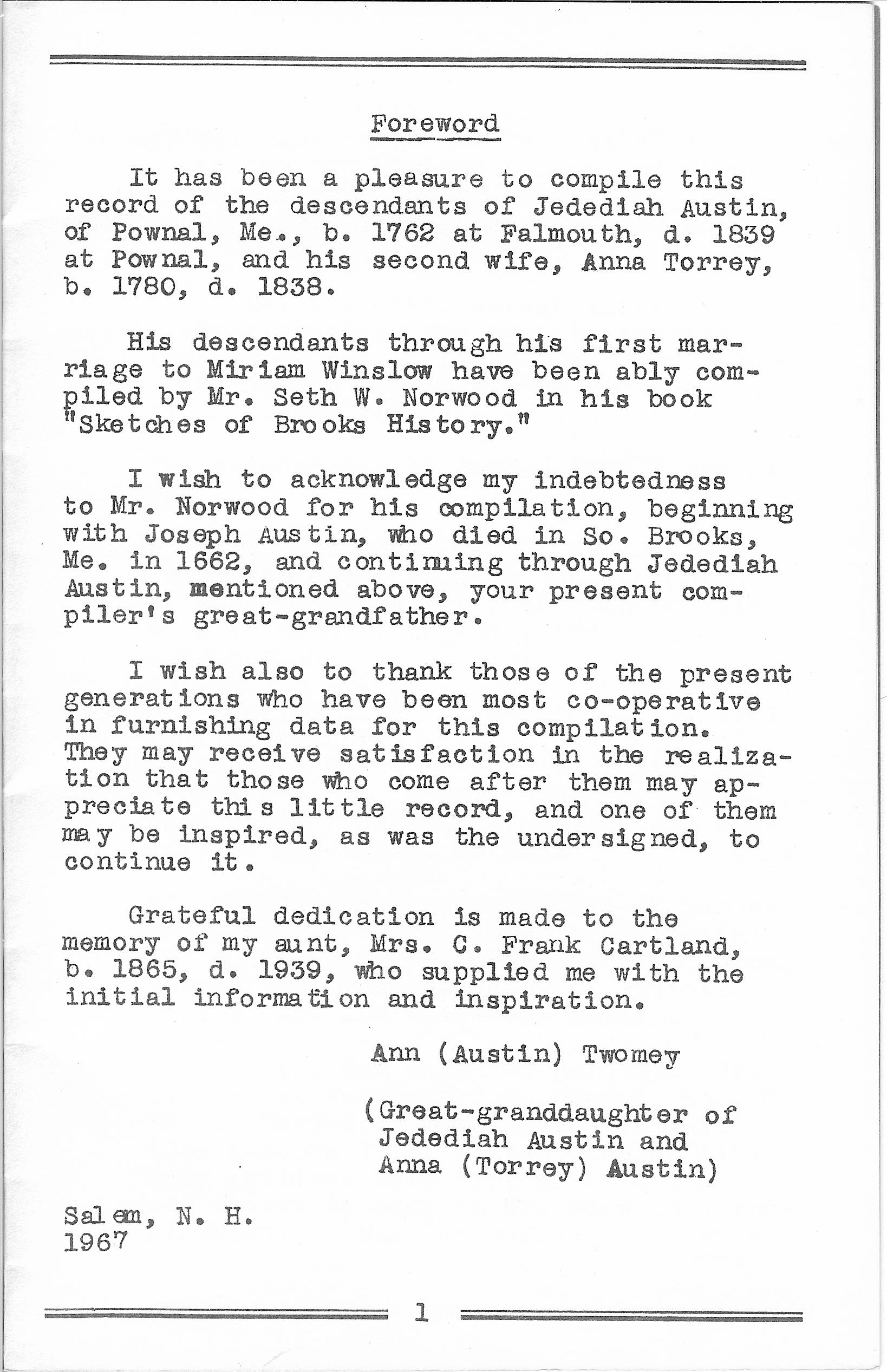 -- Small book compiled by Ann Austin Twomey, 1967. The author’s aunt is Mary C. Austin who married Cyrus Frank Cartland. This booklet has descendants of these Austins and includes names of Cartland and Twomey.